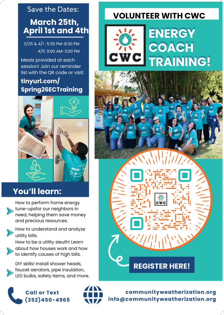 There are many other ways to assist the CWC, including interning, helping with outreach and recruitment, organizing tune-up kit supplies, photography/videography, social media, data entry projects, grant-writing or research, event planning, and fundraising. Your skills can support us reaching more Alachua County residents, lowering more bills, and saving more natural resources. If you want to help the CWC out in one of the other ways mentioned besides energy coaching, or have another skill set you think may benefit our mission, simply reach out to info@communityweatherization.org; we’d love to hear from you!